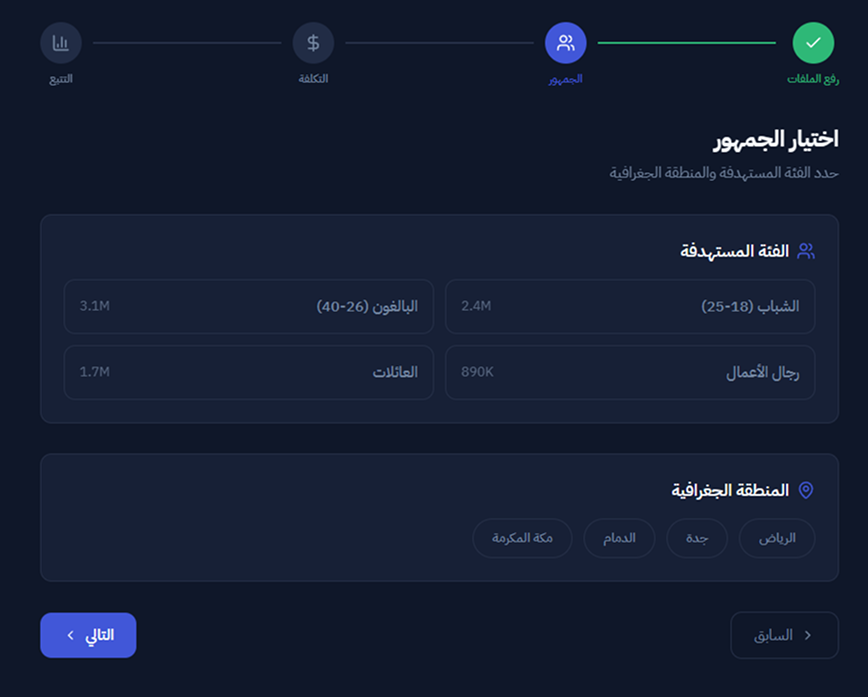 حدد الشريحة المستهدفة بدقة: اختر المنطقة الجغرافية ونوع البيئة (طلاب جامعات، موظفي شركات، زوار معارض، أو أسر عبر تطبيقات التوصيل). كلما كان استهدافك أدق، كانت نتائج حملتك أقوى في الوصول لمن يهمك حقاً.