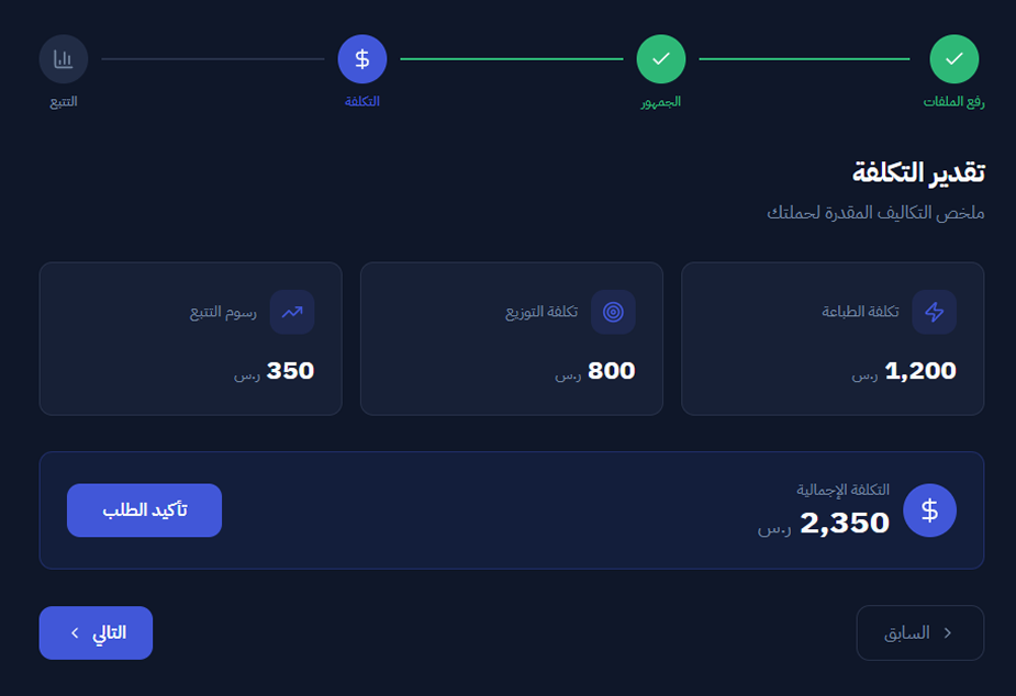 سيقوم نظامنا الذكي بتقديم عرض تفصيلي فوري يتضمن: التكلفة الإجمالية، عدد العبوات المقترح، الوصول المتوقع، وتقدير عدد مرات مسح QR بناءً على معدلات التفاعل السابقة. قرار استثماري واضح ومبني على أرقام حقيقية.